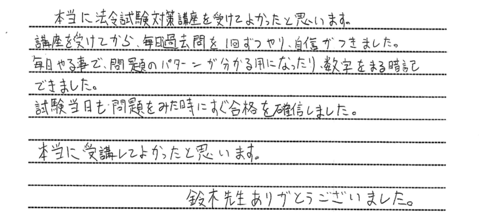 運送業法令試験対策講座 岐阜県 C社様 令和2年4月 中部運輸局受験 本当に法令試験対策講座を受けてよかった思います。 講座を受けてから、毎日過去問を1回ずつやり、自信がつきました。 毎日やることで問題のパターンが分かるようになったり、数字を丸暗記できました。 試験当日も問題を見たときにすぐ合格を確信しました。 本当に受講してよかったと思います。 鈴木先生、ありがとうございました。 行政書士 鈴木 亜紀子 行政書士の紹介 長野県 B社様 前の記事 愛知県 D社様 次の記事